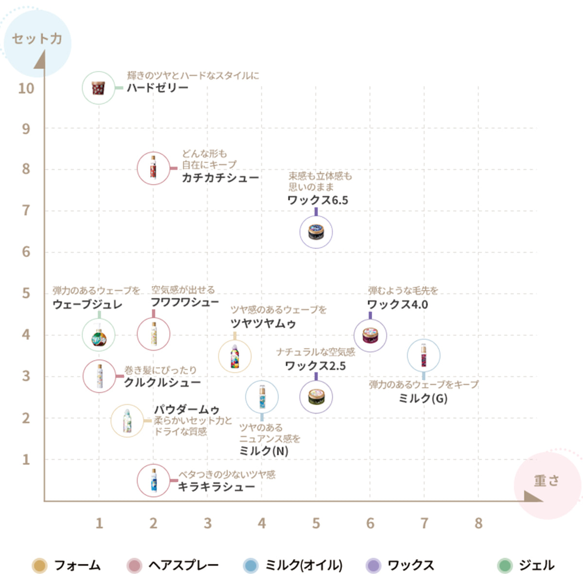 ウェーブスタイルをしっかいり再現するセット力で、ヘアカラーした髪をつややかに美しく仕上げるスタイリングフォーム。